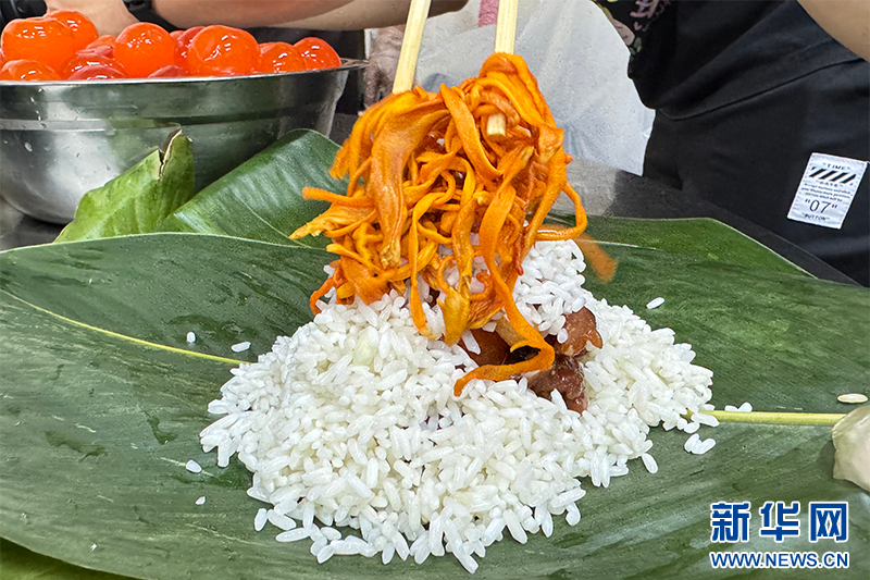 “一分钟包一个粽子,我每天能包600个。”陆永波团队成员陆玉琴,从业15年,她不仅是裹粽“快手”,更是创新先锋——大胆将富含18种氨基酸的虫草花融入馅料,让这份传统美食焕发新生。当黑猪肉的咸香、虫草花的清香与糯米的绵密在齿间交融,食客品尝到的不仅是舌尖上的惊喜,更是一份兼顾美味与健康的匠心。