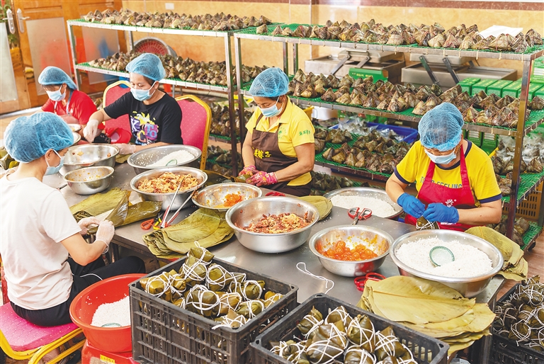 5月24日,定安县龙门镇一家粽子企业,工作人员在包粽子。海南日报全媒体记者 袁琛 摄