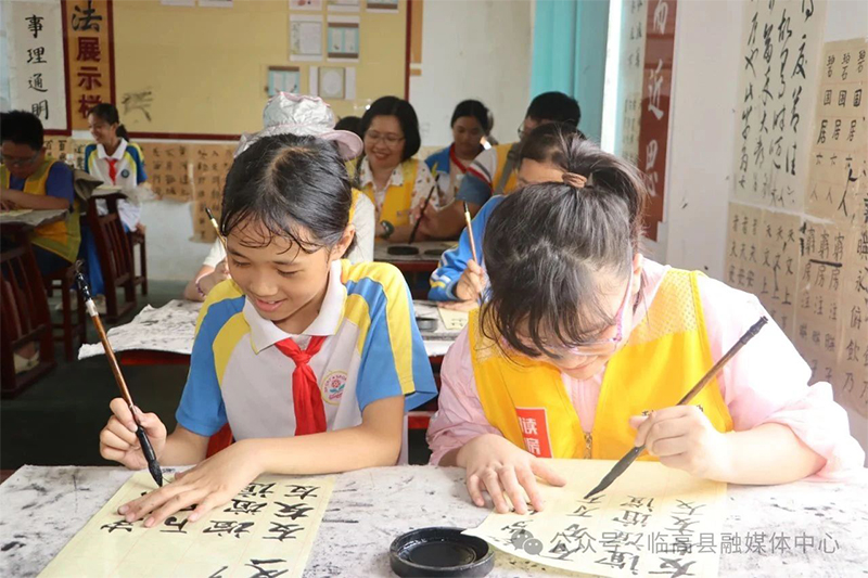 在学生交流活动中,团县委、东英镇政府联合东英学校小学部、社区教育学校开展校际交流。新加坡营员走进校园,与当地学生组队参与趣味运动会、传统手工课堂等活动。在书法课上,临高小伙伴手把手教新加坡营员握笔姿势和书写技巧,共同完成“友谊长存”等毛笔字作品。
