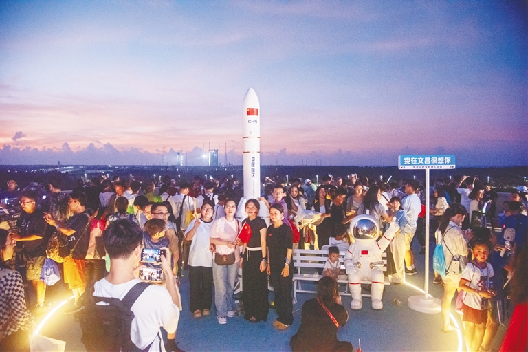 观看火箭发射的游客拍照留念。本组图片均由海南日报全媒体记者 袁琛 摄