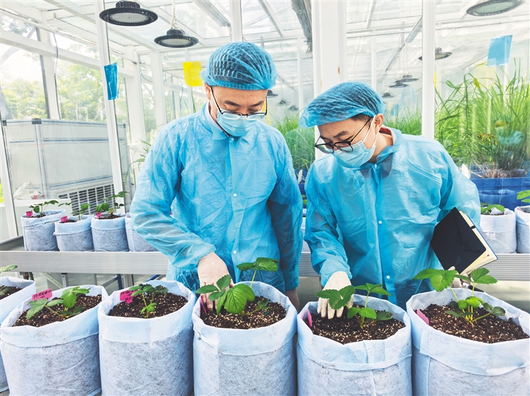 在三亚月亮岛,科研人员查看草莓苗长势。海南日报全媒体记者 黄媛艳 摄