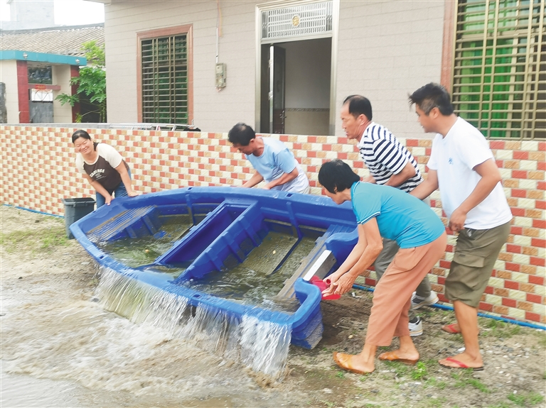 美兰区演丰镇村民清理门前屋后积水。特约记者 王聘钊 摄