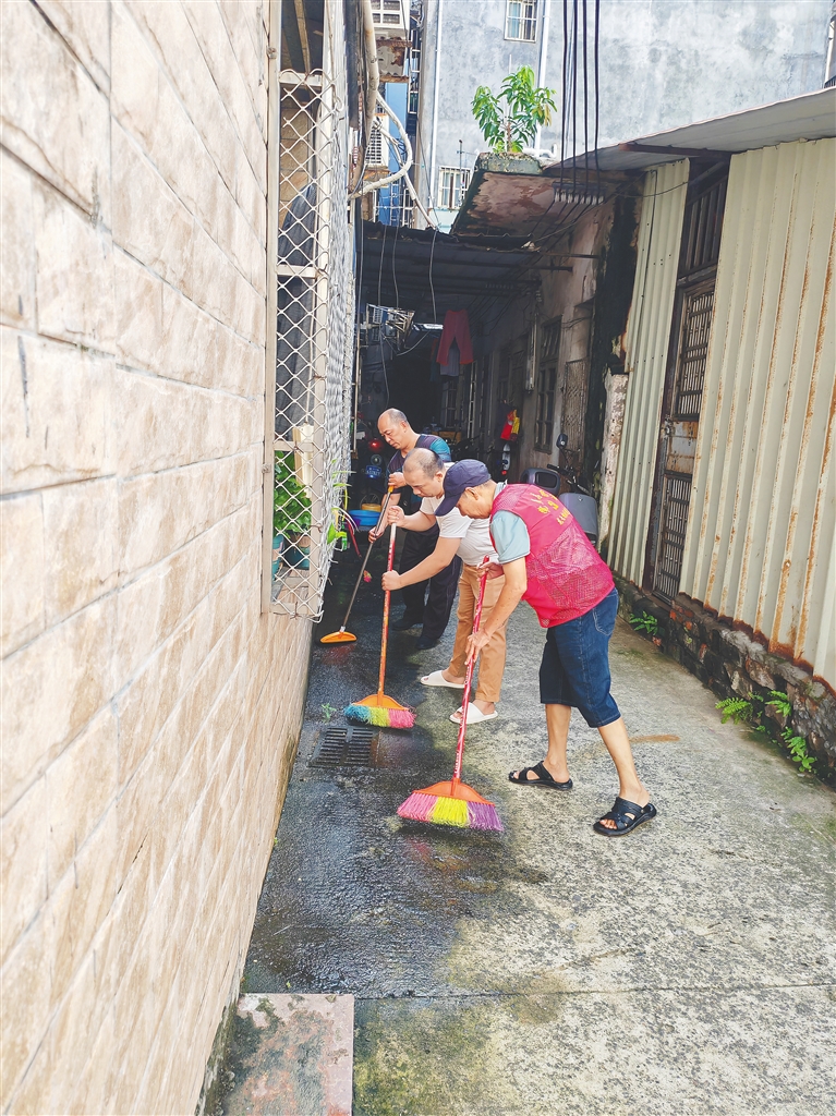 美兰区社区志愿者帮助居民清理积水。特约记者 王聘钊 摄