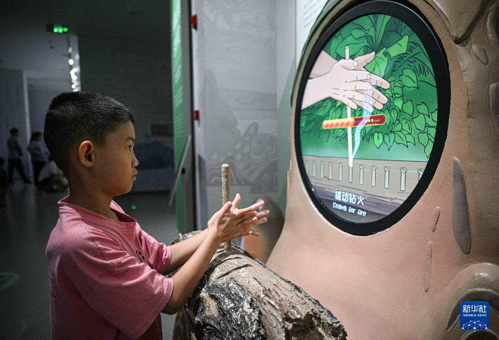 7月27日,在位于海口的海南省非遗展示中心,观众体验黎族钻木取火技艺。由海南保亭申报的黎族钻木取火技艺于2006年入选第一批国家级非物质文化遗产名录。新华社记者 蒲晓旭 摄