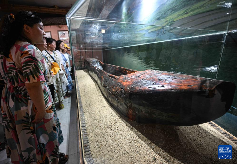 游客在位于海南保亭的槟榔谷文化旅游区观看黎族独木舟(5月15日摄)。新华社记者 蒲晓旭 摄