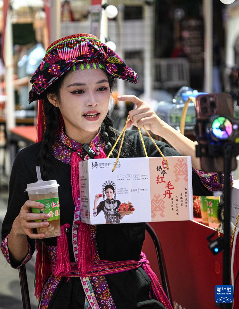 网络主播在海南保亭为保亭红毛丹进行视频直播带货(7月12日摄)。新华社记者 蒲晓旭 摄