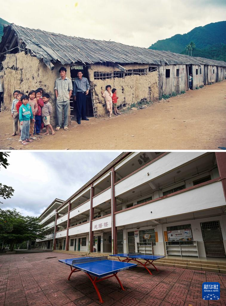 这是一张拼版照片。上图:20世纪90年代在海南保亭毛感乡拍摄的山村教学点(资料照片);下图:2025年7月22日拍摄的毛感乡中心学校(新华社记者蒲晓旭摄)。新华社发