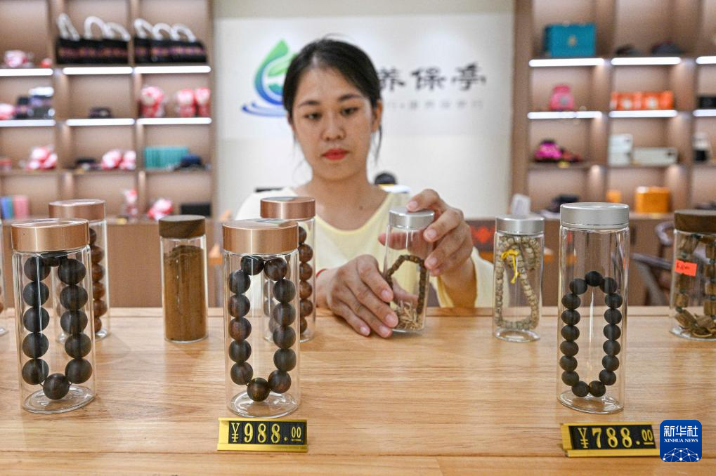 在位于海南保亭的“康养保亭”品牌体验店拍摄的沉香、黄花梨手串(7月17日摄)。保亭依托生态与气候优势大力发展康养产业。新华社记者 蒲晓旭 摄