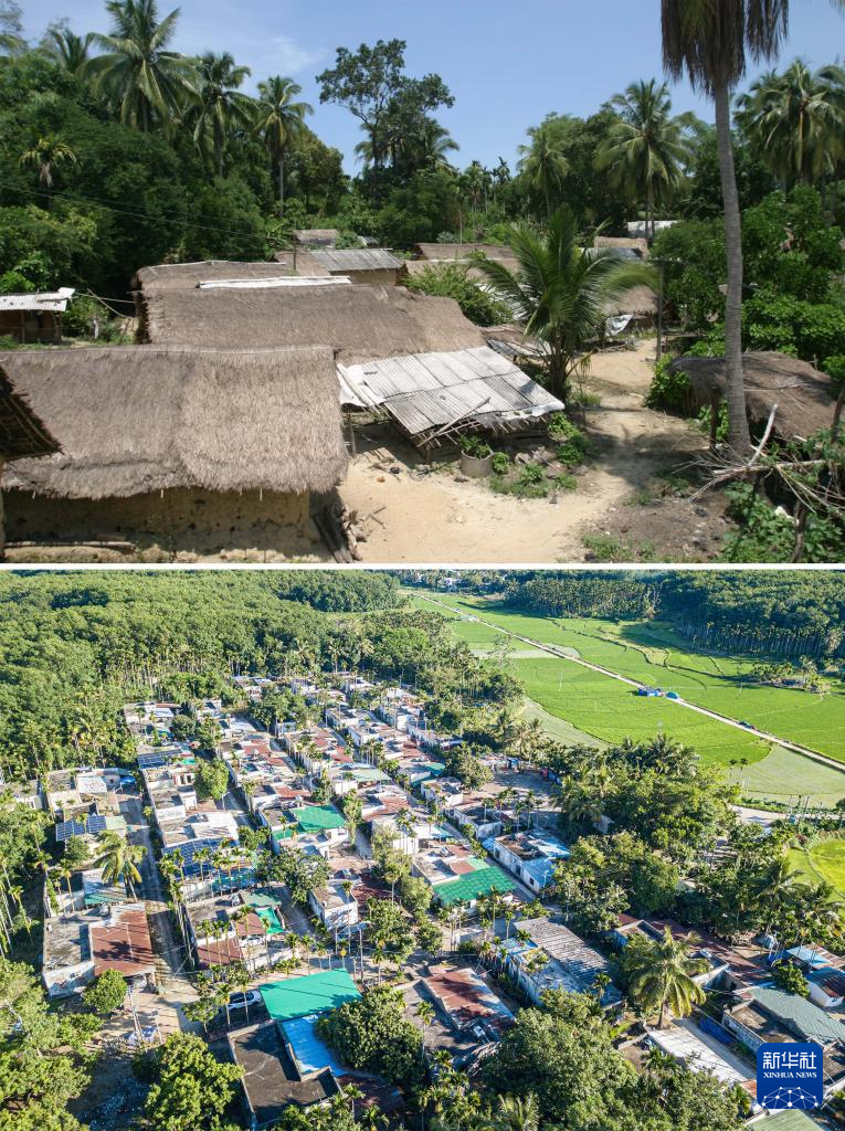 这是一张拼版照片。上图:海南保亭什示巴旧村一角(2005年7月19日摄,新华社发);下图:海南保亭什示巴村(无人机照片,2025年7月16日摄,新华社记者蒲晓旭摄)。新华社发