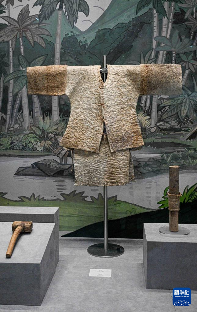 7月27日在位于海口的海南省非遗展示中心拍摄的树皮衣、树皮裤。由海南保亭申报的黎族树皮布制作技艺于2006年入选第一批国家级非物质文化遗产名录。新华社记者 蒲晓旭 摄