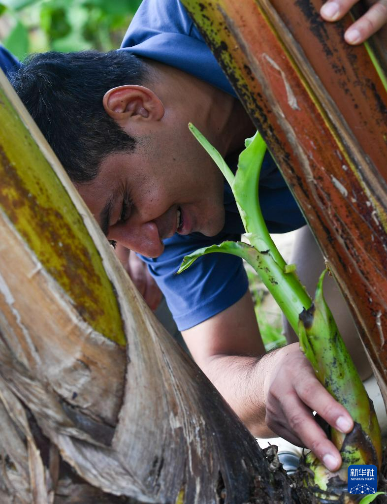 7月29日,瓦西姆·拉扎在海南三亚崖州湾科技城香蕉试验田内查看香蕉。新华社记者 杨冠宇 摄