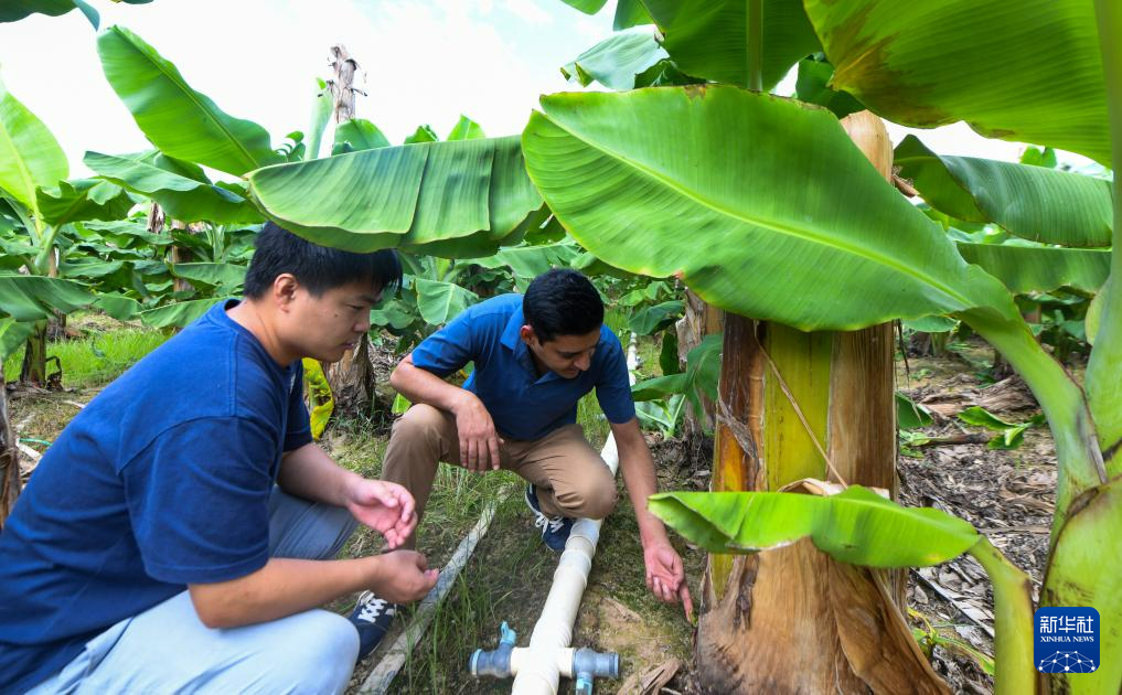 7月29日,瓦西姆·拉扎(右)在海南三亚崖州湾科技城香蕉试验田内查看香蕉。新华社记者 杨冠宇 摄