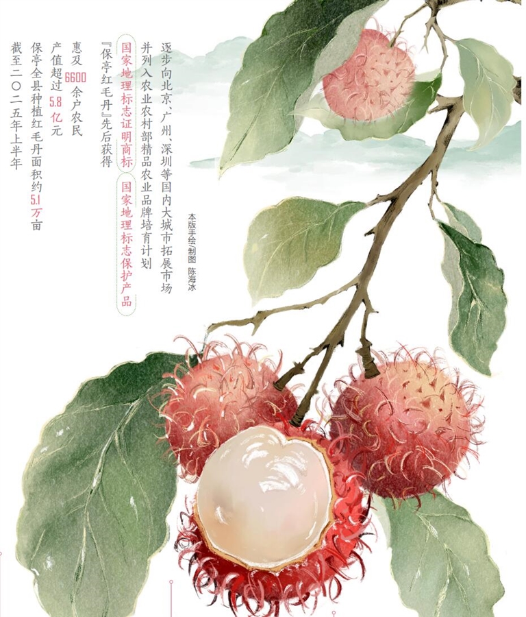 目前,红毛丹已成为保亭农业领域的主要产业,截至2025年上半年,全县种植面积约有5.1万亩,产值超过5.8亿元,惠及6600余户农民,是国内红毛丹种植规模最大、产业最成熟的主产区,成为保亭农业的“金字招牌”。