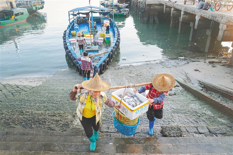 8月20日清晨,儋州白马井中心渔港,出海捕捞的渔船靠岸,“渔婆”们肩挑手抬,将新鲜海产运上岸。海南日报全媒体记者 陈元才 摄