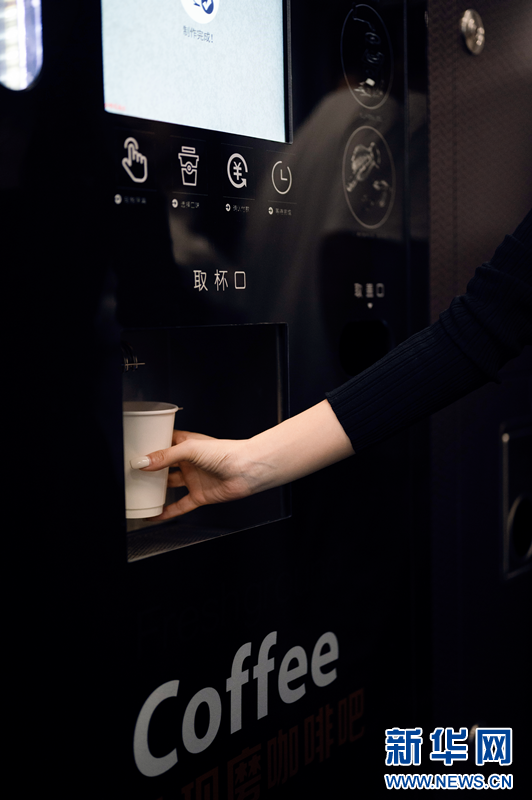 三乐旅游铁路内部的AI打卡机和自助咖啡机。新华网发(王知玥 摄)