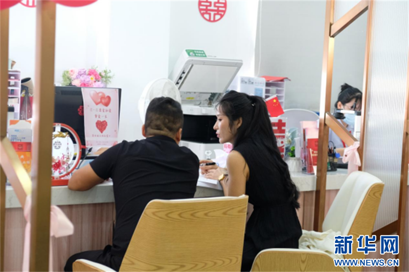 一对新人正在三亚办理结婚登记手续。新华网发