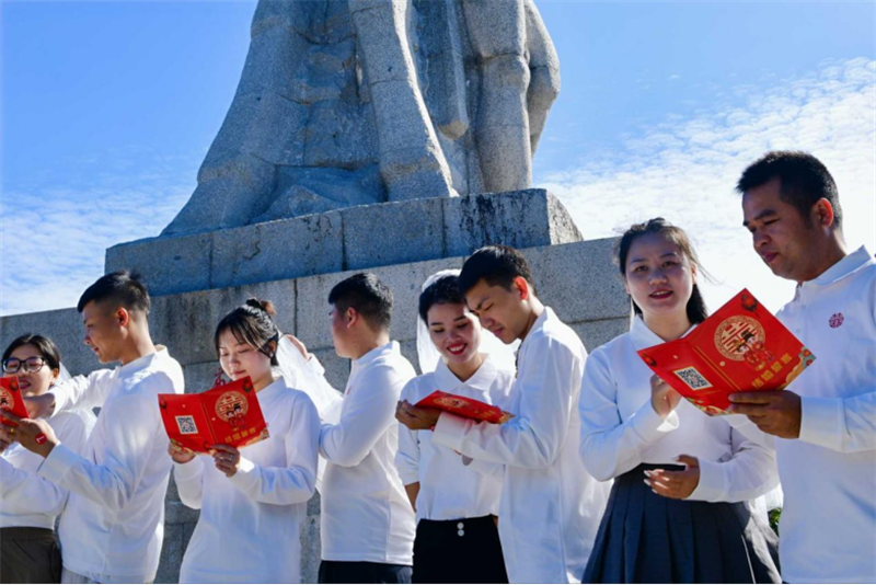三亚市鹿回头婚姻登记处为领证新人举办集体婚礼。新华网发